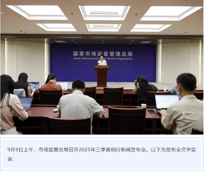 各位记者朋友、各位来宾,大家上午好!初秋的北京,九三盛大阅兵活动刚刚落下帷幕。铭记历史,传承薪火。磅礴奋进,砥砺前行。今天,我们相聚于此,共同参加市场监管总局2025年第三季度例行新闻发布会。