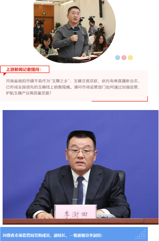 感谢您的提问。我省南阳市镇平县玉雕市场规模大,年产值超500亿元,玉雕从业经营主体将近5.6万户,商店(摊位)4万多家,从业人员约40万人。近年来,在市场监管总局的指导下,河南市场监管部门坚持服务与监管并重,坚持线上线下综合施策,着力规范玉器市场交易秩序,助力我省玉器产业高质量发展。具体做法主要有三个方面: