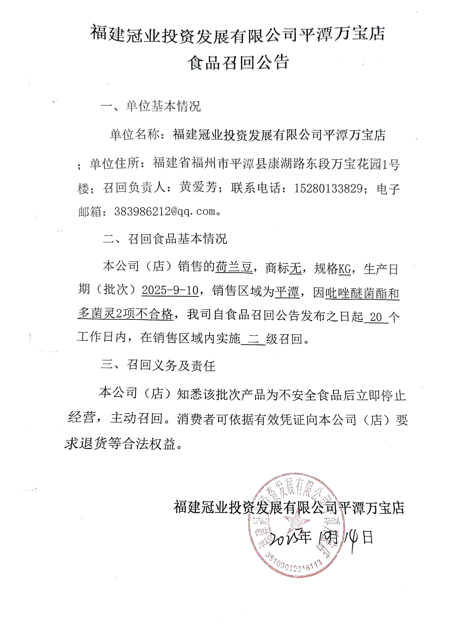 福建冠业投资发展有限公司平潭万宝店食品召回公告(20251014)