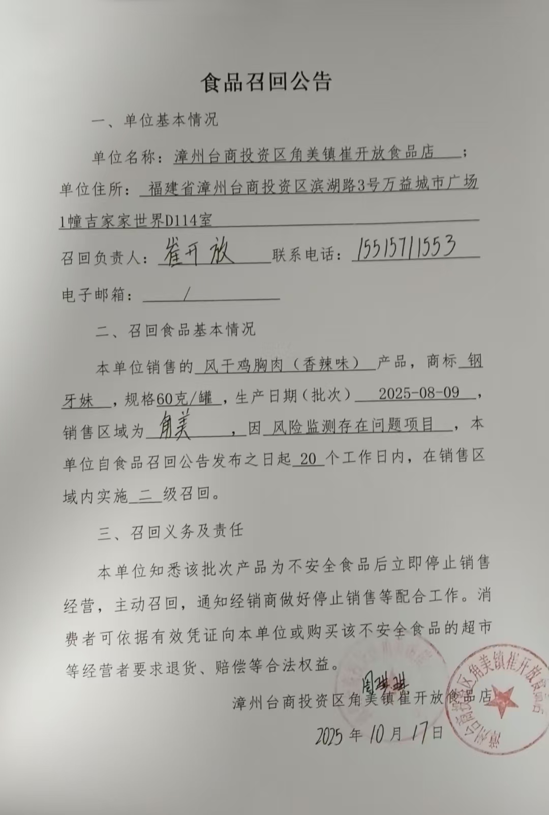 漳州台商投资区角美镇崔开放食品店食品召回公告(风干鸡胸肉)(20251017)