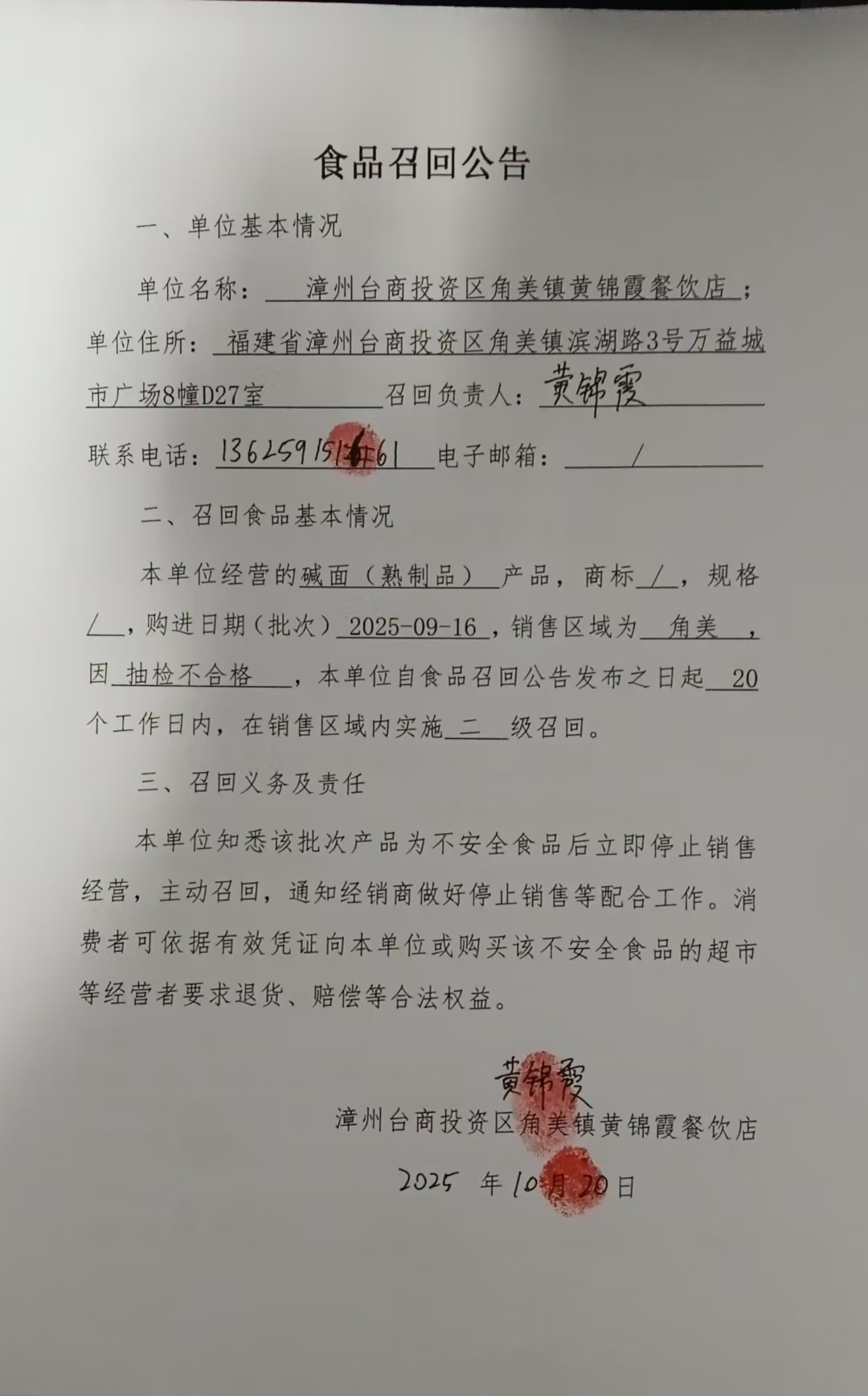 漳州台商投资区角美镇黄锦霞餐饮店食品召回公告(碱面熟制品)(20251020)