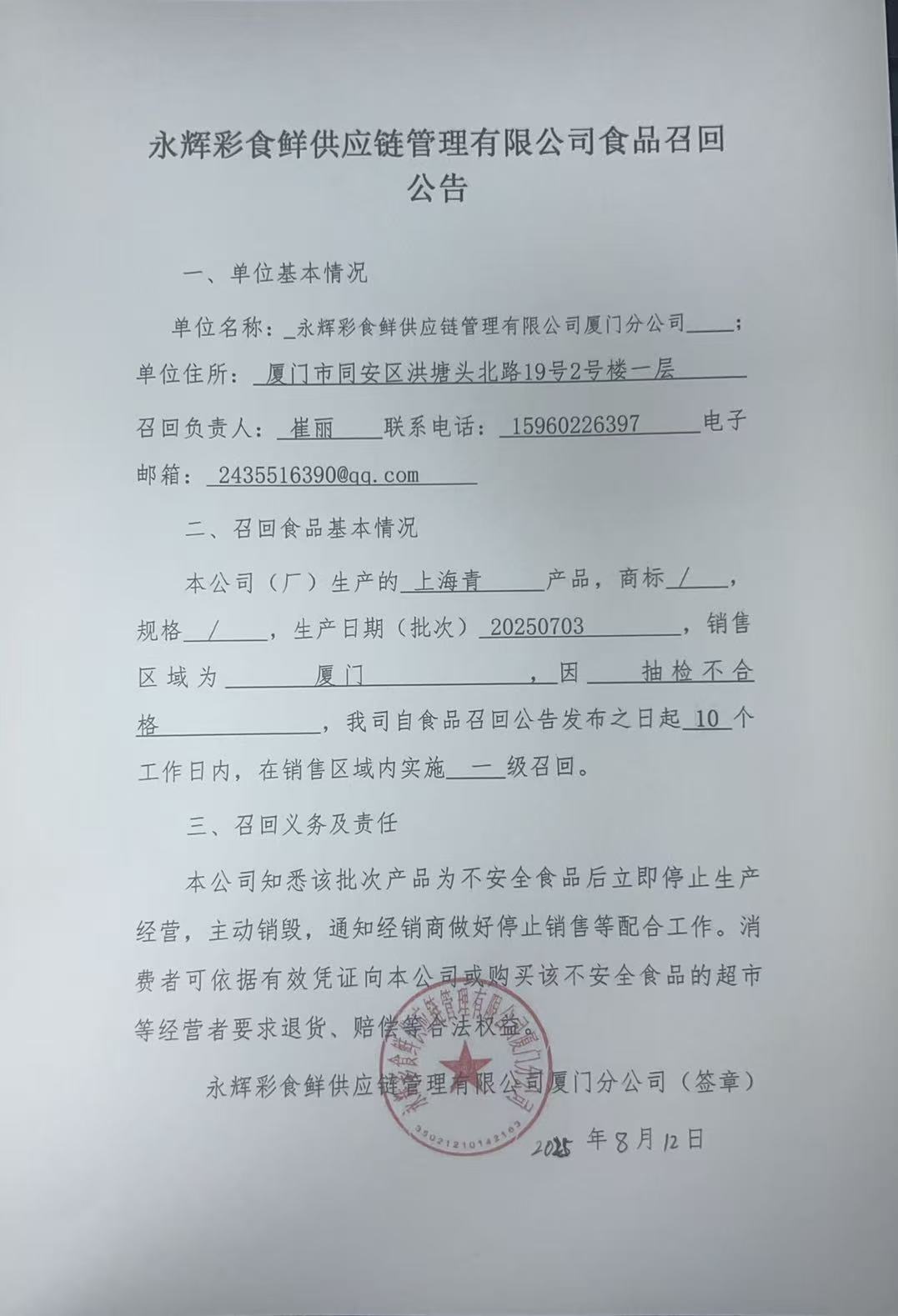 永辉彩食鲜供应链管理有限公司食品召回公告(20250812)