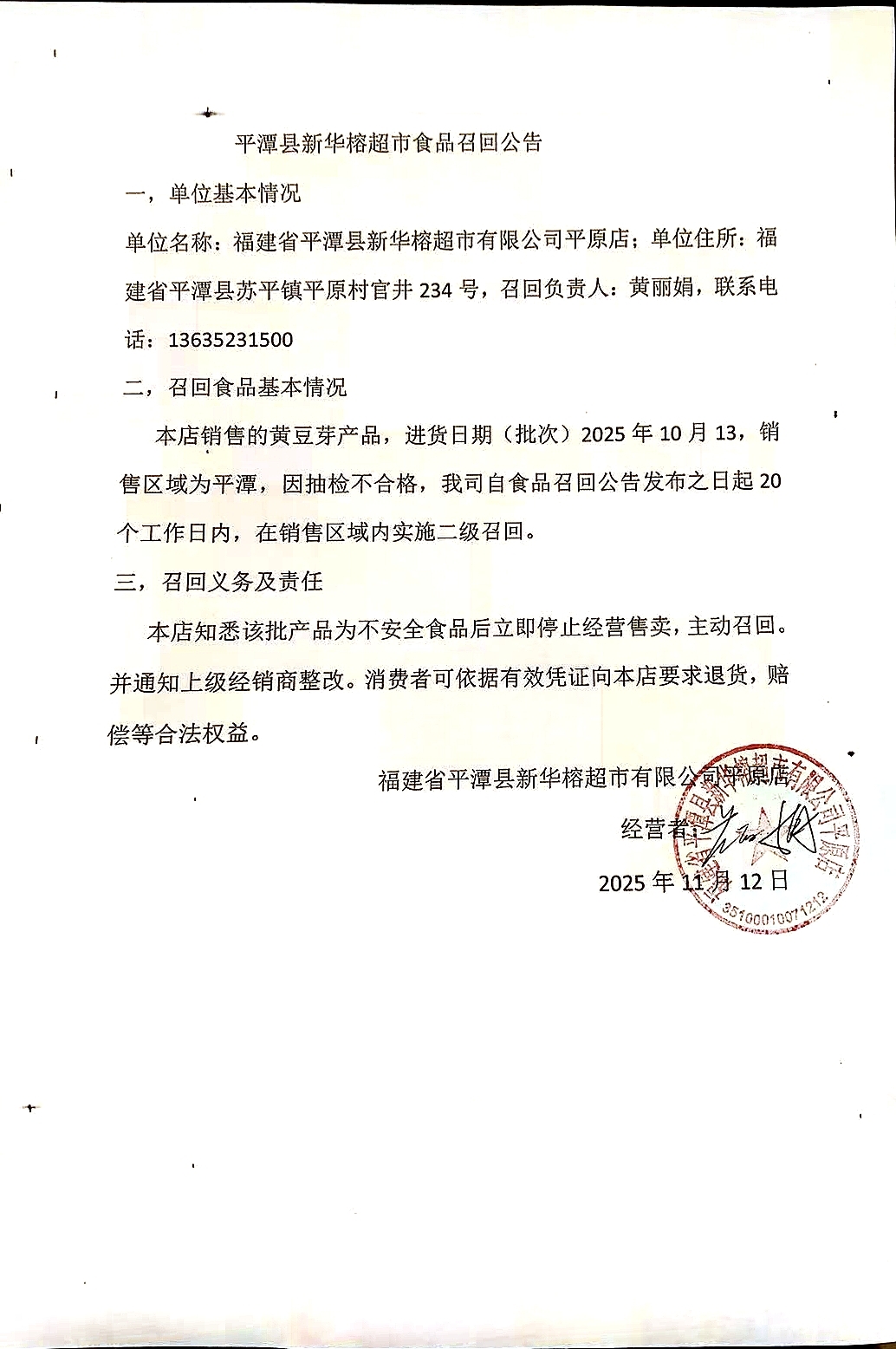 福建省平潭县新华榕超市有限公司平原店食品召回公告(20251112)