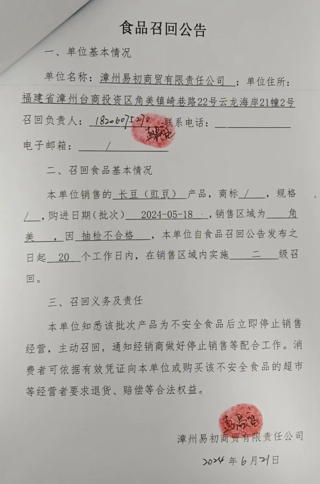 漳州易初商贸有限责任公司食品召回公告(20240621)
