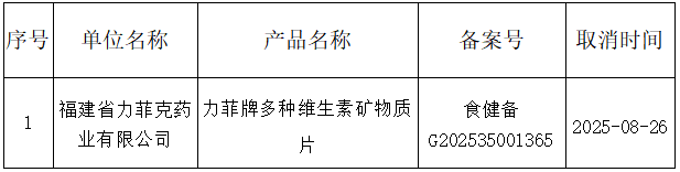 根据《保健食品注册与备案管理办法》(国家市场监督管理总局令第31号修订),依据福建省力菲克药业有限公司申请,经研究,同意该公司1款产品(详见表格)取消保健食品备案。